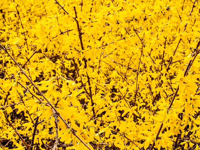 개나리는 첫 꽃망울이 터지고 나면 따뜻한 햇살을 받고 불과 며칠 만에 산책로 전체를 노란 융단으로 덮어버리는 무서운 속도를 자랑합니다.